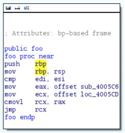 The figures above demonstrate a very simple function before and after the code diffusion transform, using screenshots from IDA. In the first figure, there is a complete control flow graph; in the second, however, the first basic block no longer jumps directly to either of the following blocks; instead, it must refer at runtime to a data section elsewhere in the application before it knows where to jump in either case. Running this code diffusion transform over an entire application reduces the entire program from a set of connected-graph functions to a much larger set of single-basic-block “functions.”