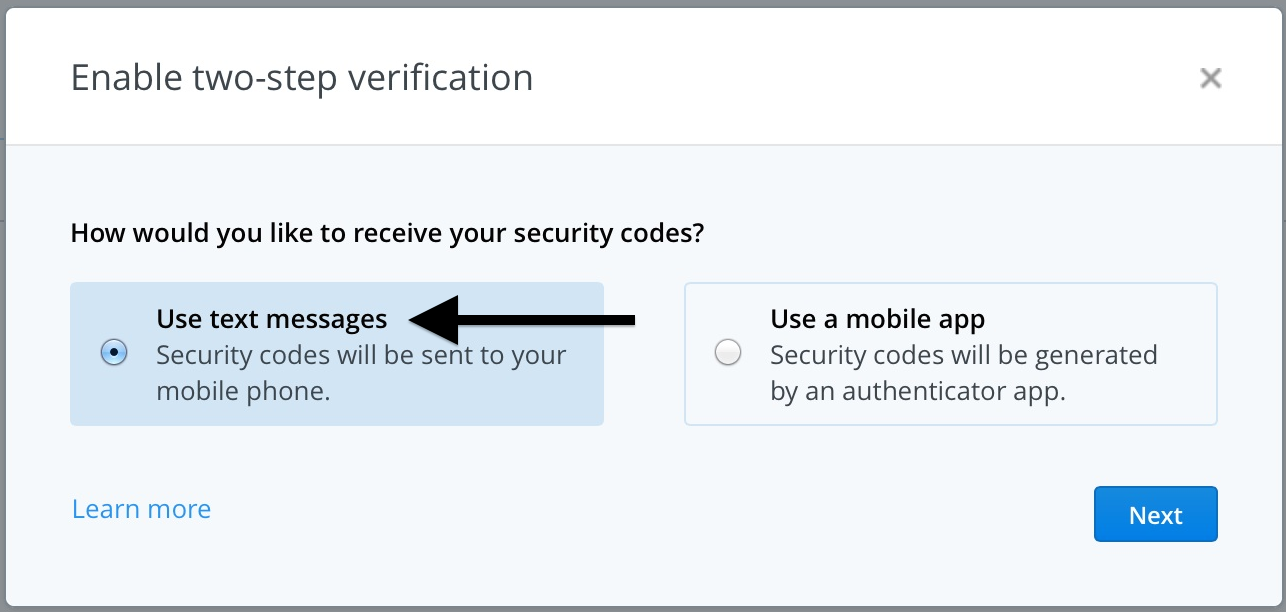 6. For the purposes of this tutorial we’ll select the “Use text messages” option. This will send 2FA codes to your phone as an SMS.