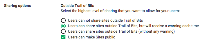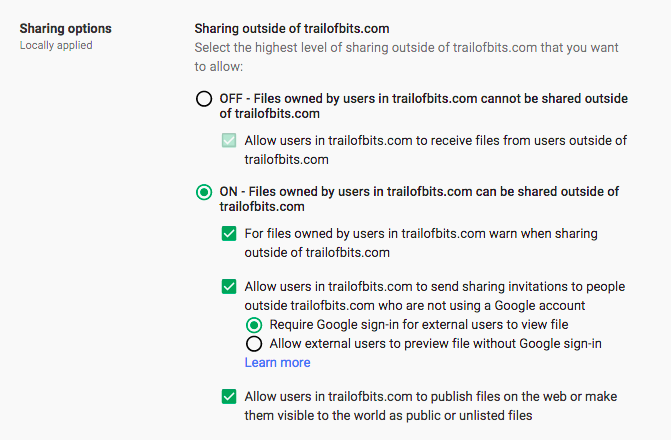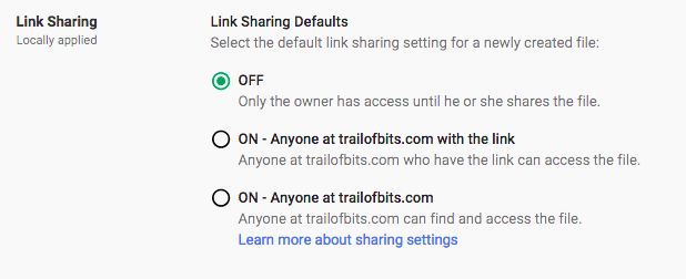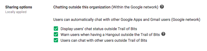 The default settings for Mail, Drive, Talk, and Sites can lead to over-sharing of data. Retain the flexibility for employees to choose the appropriate setting, but tighten the defaults to start with the data private and warn users when it is not. Currently, there is no universal control; you have to make changes to each Google app individually.