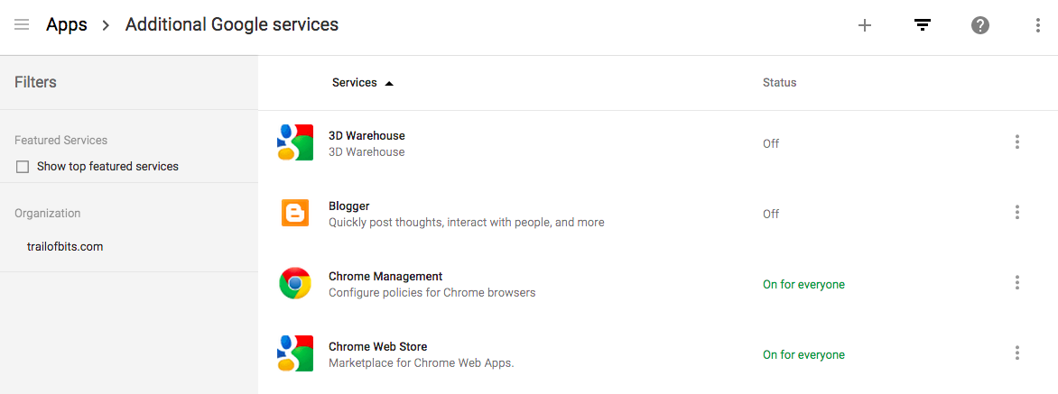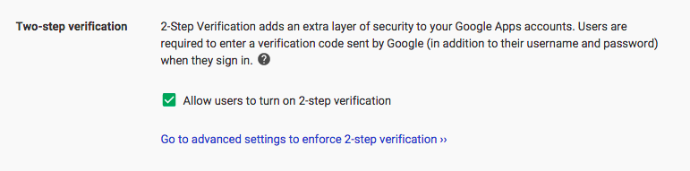 Note: The advanced settings expose an option to force 2FA on every user on your domain. To use this feature properly, you must create an exception group to allow new users to set up their accounts. tl;dr Ignore the enforcement feature and just go bop your users over the head when you see they haven’t turned 2FA on yet.
