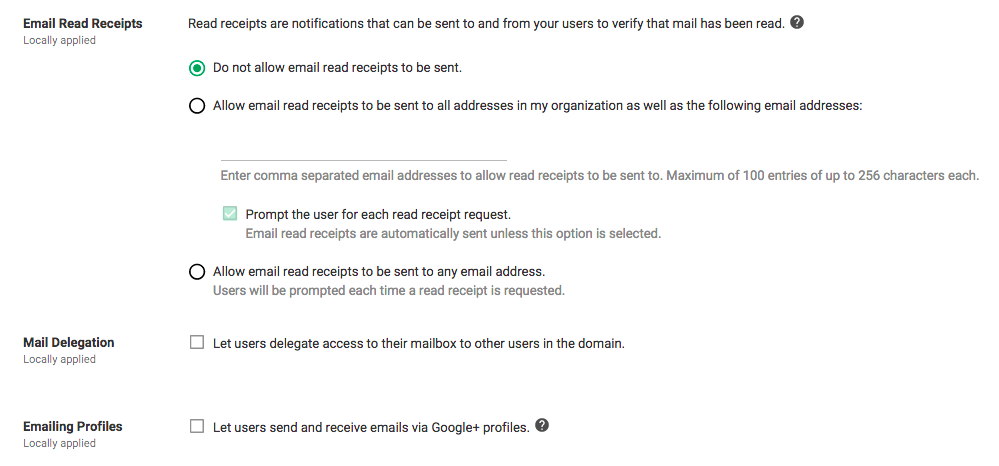 Gmail provides a wealth of options that allow users to forward, share, report, or disclose their emails to third parties. Any of these options could enable an inadvertent disclosure or provide a handy backdoor to an attacker who has lost their primary method of access. Disable read receipts, mail delegation, emailing profiles, automatic forwarding, and outbound gateways.