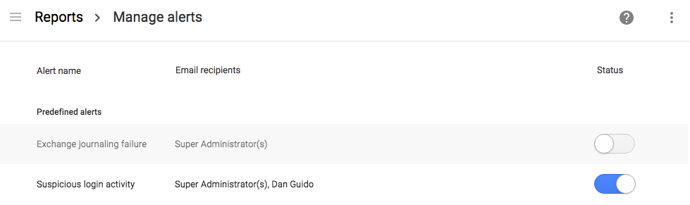 Your defenses will give way at some point. When this happens, you’ll want to know it, fast. Enable predefined alerts to receive an email when major changes are made to your Google Apps. Turn on alerts for suspicious login activity, admin privileges added or revoked, users added or deleted, and any settings changes. Send the alerts to a normal user, since you wouldn’t be logged into the Super Administrator regularly.