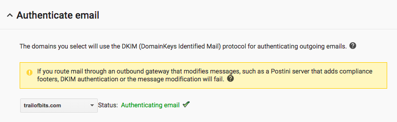 Left unprotected, it is easy for an attacker to spoof an email that looks like it came from your CEO and send it to your staff, partners, or clients. Ensure this does not happen. Turn on SPF and DKIM to authenticate email for your domain. Both require modifications to TXT records in your DNS settings.