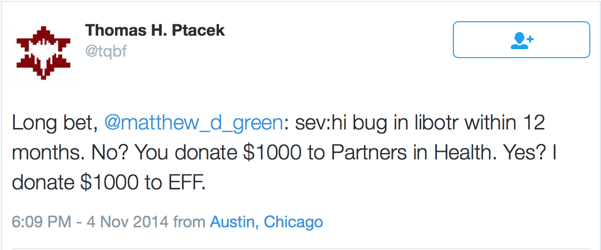 On November 4, 2014, Thomas Ptacek (of Starfighter) bet Matthew Green (of Johns Hopkins) that libotr, a popular library used in secure messaging software, would have a high severity (e.g. remote code execution, information disclosure) bug in the next 12 months. Here at Trail of Bits, we like a good wager, especially when the proceeds go to charity. And we just happened to have an automated bug-finding system laying around, itching for something to do. The temptation was too much to resist: we decided to use our automated bug-finding system from the Cyber Grand Challenge to look for bugs in libotr.