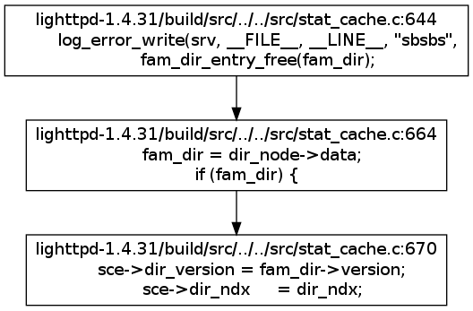 It’s time to report potential errors for expert analysis. PointsTo searches through the data-flow graph, looking for flows from assignments to FREE down to dereferences. These flows are converted into a program slice of the source code lines, showing the path that execution needs to follow in order to produce a use-after-free. Here’s an example program slice of a real bug: