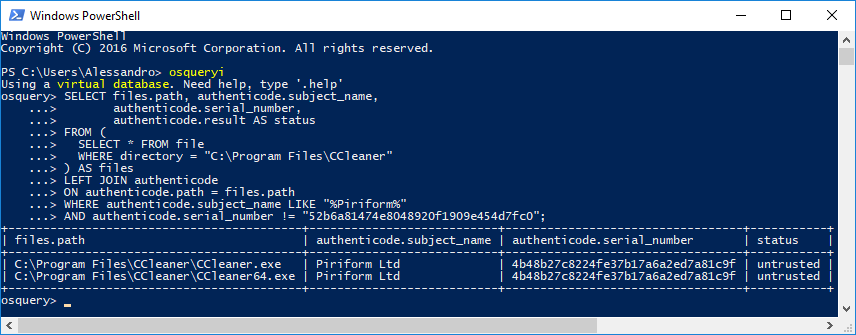 Recently, 2.27 million computers running Windows were infected with malware signed with a stolen certificate from the creators of a popular app called CCleaner, and inserted into its software update mechanism. Fortunately, signed malware is now simple to detect with osquery thanks to a pull request submitted by our colleague Alessandro Gario that adds Windows executable code signature verification (also known as Authenticode). This post explains the importance of code signatures in incident response, and demonstrates a use case for this new osquery feature by using it to detect the recent CCleaner malware.