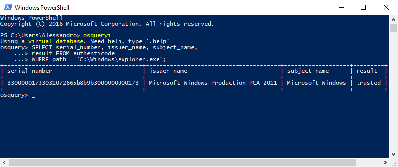 Here’s a simplified example of using osquery to check a Windows executable’s code signature: