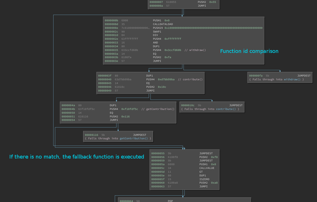 (*) For simplification, the Owner inheritance was removed from the source code. You can find the solidity file and the runtime bytecode here: fallback