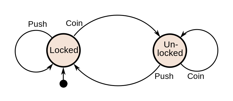 The state machine in the Hedgehog post is a turnstile with two states (locked and unlocked) and two actions (inserting a coin and pushing the turnstile), with “locked” as its initial state. We can copy this code verbatim.