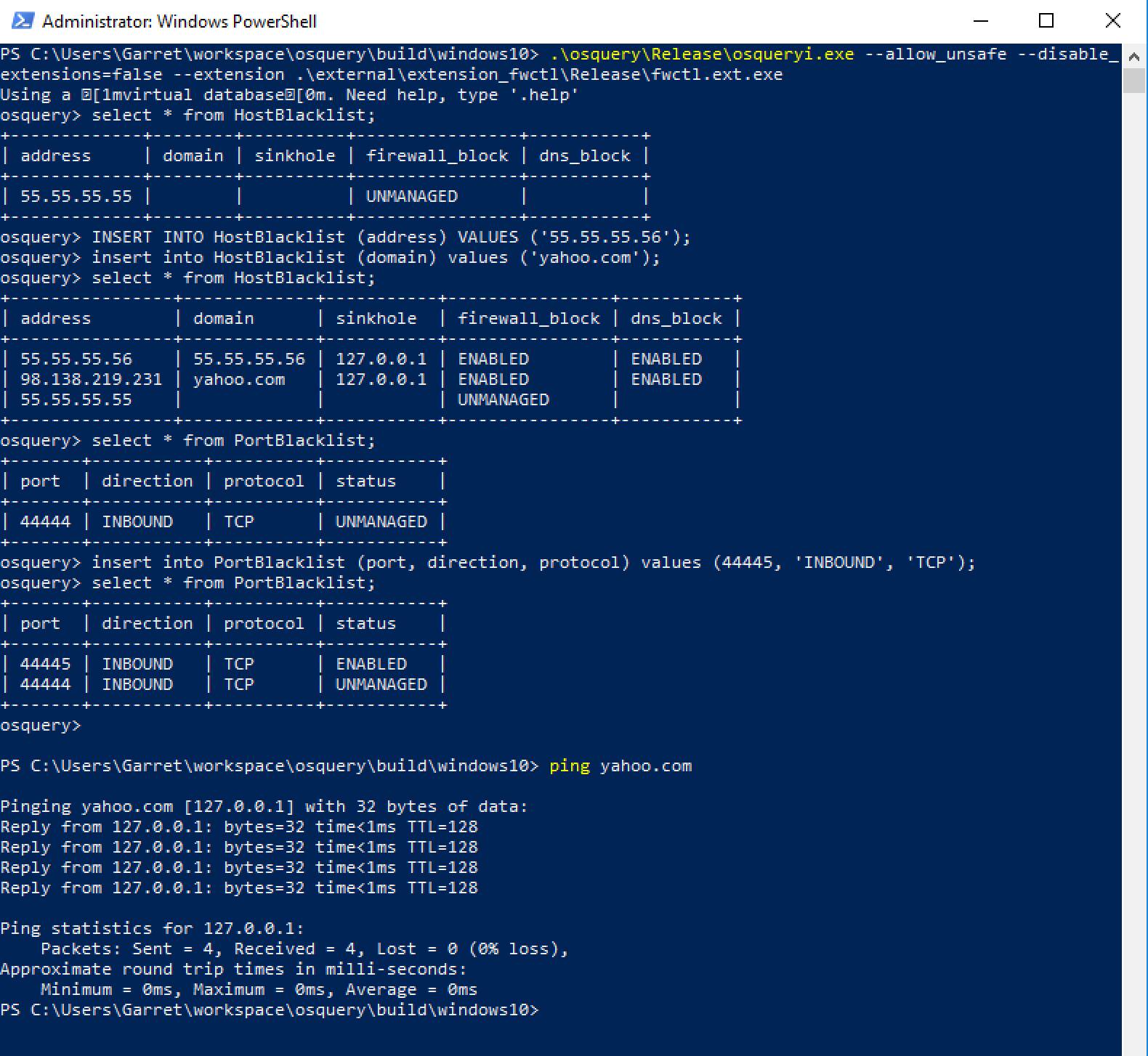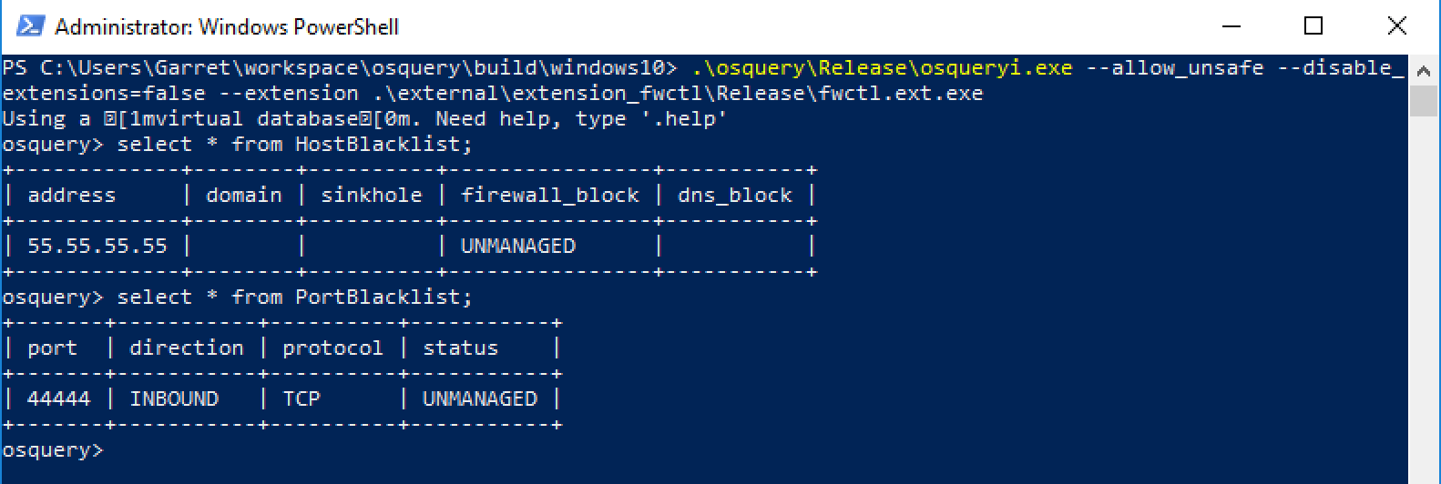The extension creates two new tables: HostBlacklist and PortBlacklist. These virtual tables generate their entries via the underlying operating systems’ native firewall interfaces: iptables on Linux, netsh on Windows, and pfctl on MacOS. This keeps them compatible with the widest possible range of deployments and avoids further dependence on external libraries or applications. It will work with your existing configuration, and, regardless of underlying platform, provide the same interface and capabilities.