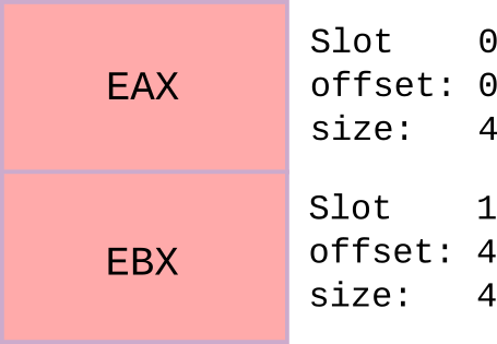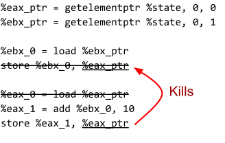 The DSE pass needs to recognize loads/stores through %eax_ptr and %ebx_ptr as being different. The DSE pass does this by chopping up the State structure into “slots”, which roughly represent registers, with some small distinctions for cases where we bundle sequence types like arrays and vectors as one logical object. The slots for our simplified State structure are: