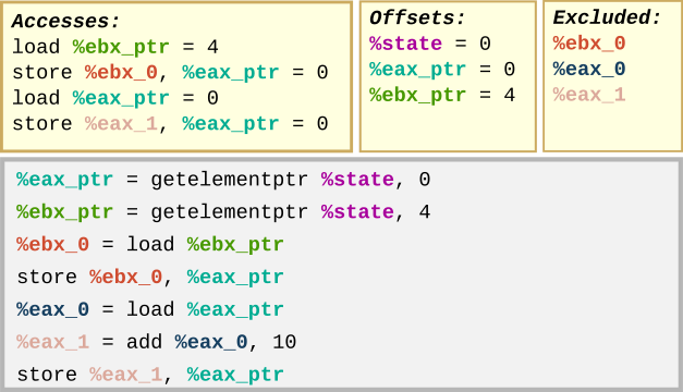 The third data structure shown here is the exclude set. This keeps track of all the other values instructions might refer to that we know shouldn’t contact the state structure. These would be the values read by load instructions, or pointers to alloca’d memory. In this example, you can also see that if a value is already in the offsets map or exclude set, any value produced from one such value will remain in the same set (e.g. %eax_1 is excluded since %eax_0 already was). You can think of the exclude set as the Do-Not-Call list to the offset map’s address book.
