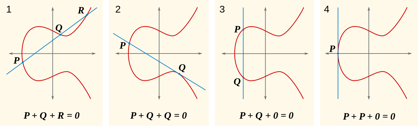 x + y = y + x, x + (y + z) = (x + y) + z, etc. This is because points on the curve form an Abelian group. You can see a visualization of this addition in fig. 2, below. - A point can be multiplied by some natural number (call it n) by adding it to itself n times.
