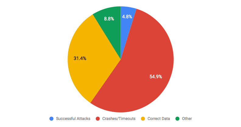 I tested a total of 938 bit flips, and I found that 45 of them, or 4.8%, successfully produced the correct private keys. Nearly 55% resulted in either a crash or a timeout, meaning that the program failed to create a signature. Approximately 31% did not alter the partial signatures.