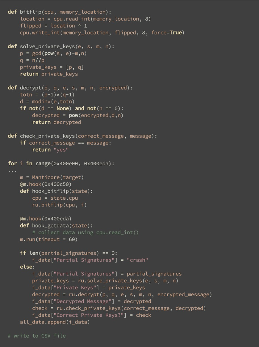 I wrote a Manticore script that would iterate through each consecutive byte of memory, alter an instruction by flipping a bit in that byte, and execute the RSA signing program. For each execution that did not result in a crash or a timeout, I used the output to try to extract the private keys. I checked them against the correct keys by attempting to successfully decrypt another message. With all of this data, I generated a CSV file of the intermediate and final results from each bit flip, including the partial signatures, the private keys, and whether the private keys were accurate.