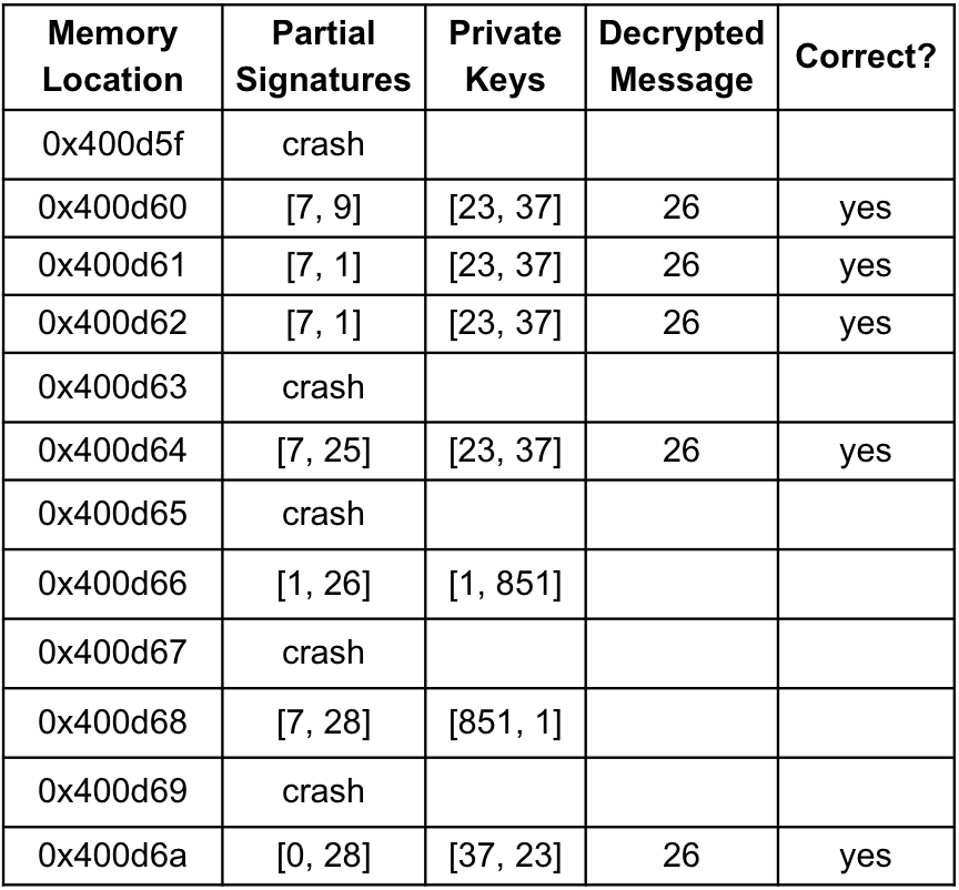 This spring and summer, as an intern at Trail of Bits, I researched modeling fault attacks on RSA signatures. I looked at an optimization of RSA signing that uses the Chinese Remainder Theorem (CRT) and induced calculation faults that reveal private keys. I analyzed fault attacks at a low level rather than in a mathematical context. After analyzing both a toy program and the mbed TLS implementation of RSA, I identified bits in memory that leak private keys when flipped.