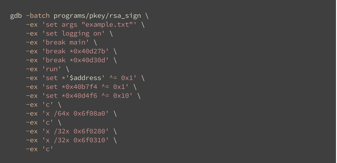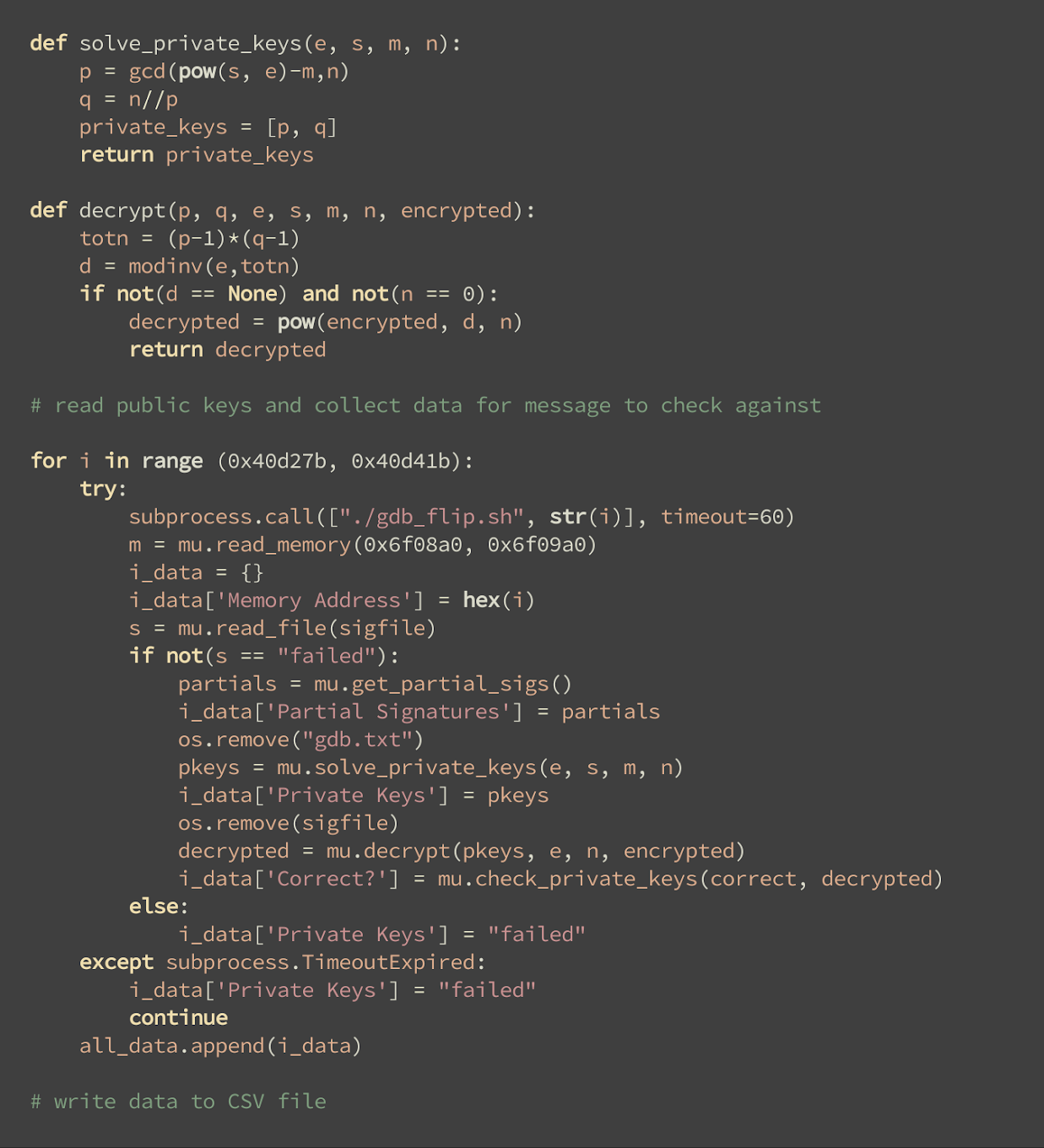Just as I had with the toy program, I started to try to automate the fault attacks and identify the bit flips that would leak the private keys. In order to speed up the process, I wrote a GDB script instead of using Manticore. I found bit flips that would allow me to bypass both of the checks that would normally prevent the creation of a faulted signature. I used GDB to alter both of those memory instructions. In a process identical to the toy program, I also flipped one bit in a given memory address. I then used Python to loop through each byte of memory, call this script, and try to extract the private keys, again checking whether they were correct by attempting to decrypt a known message. I collected the solved private keys and wrote the results to a CSV file of all the bit flips.
