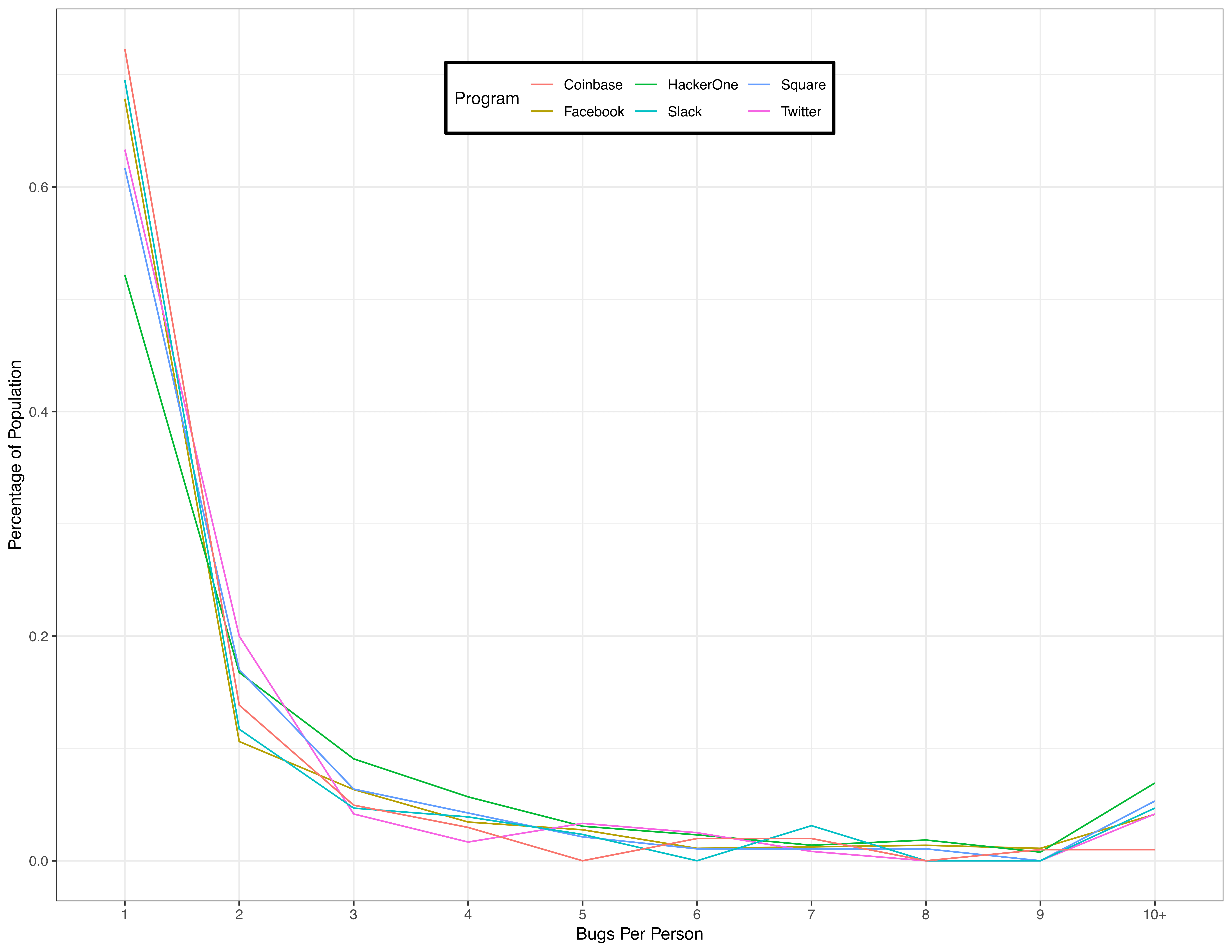 The most interesting group was arbitrarily lumped into the 10-or-more-bugs category. (See how the line trends upward at the end of the plot? You don’t want to do that. Plot all your data.) The top 1% (6 participants) in the HackerOne data landed 161 bounties and the top 1% (7 participants) in the Facebook data accounted for 274 bugs. That’s an average of 27 and 39 bugs per person, respectively! There may be stratification even among the top earners, but without knowledge of this distribution at the top (i.e., the variance), it remains a mystery.