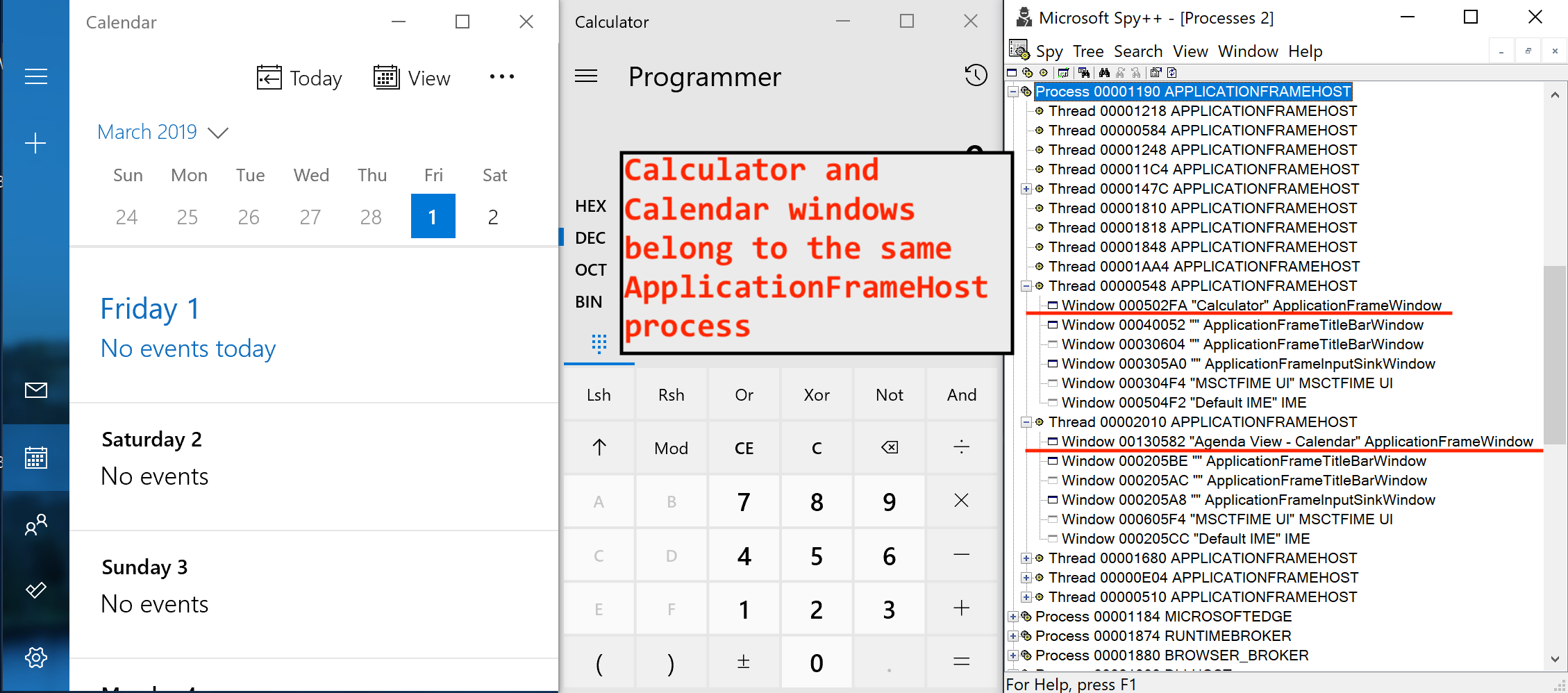 Two minor changes were necessary to use the fuzzer on Windows 10. First was a tiny change to build the fuzzer on 64-bit Windows. The second change was enabling the fuzzer to target a specific window handle via a command line argument. Fuzzing a specific handle was a quick solution to the problem of fuzzing Universal Windows Platform (UWP) applications. The window message fuzzer is oriented to fuzzing windows belonging to a specific process, but UWP applications all display their UI via the same process (Figure 2). This meant that the fuzzer could not target the main window of UWP applications.