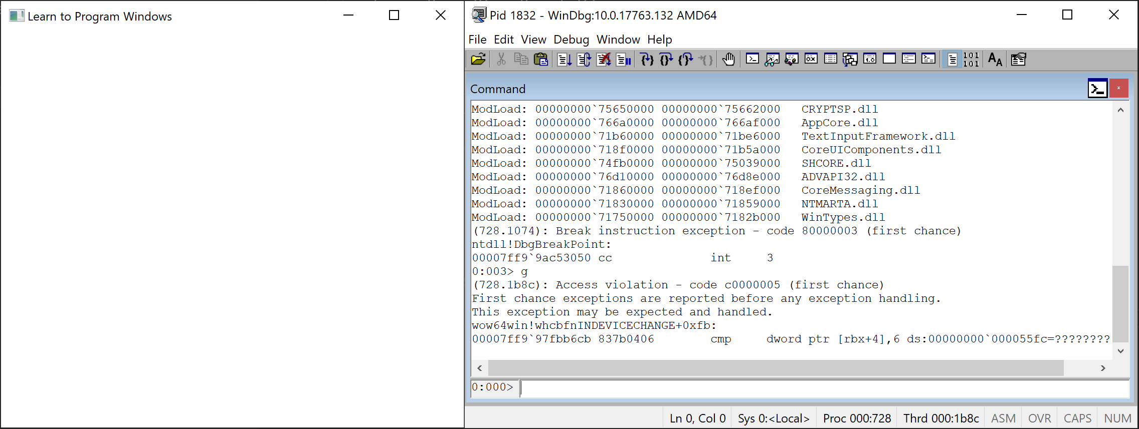 Unfortunately our curiosity got the better of us and we had to make one exception. One common problem seemed to plague multiple unrelated applications. Some debugging showed the responsible message was WM_DEVICECHANGE. When the fuzzer sent that message, it would even crash the simplest application possible — the official Windows API HelloWorld Sample (Figure 3).