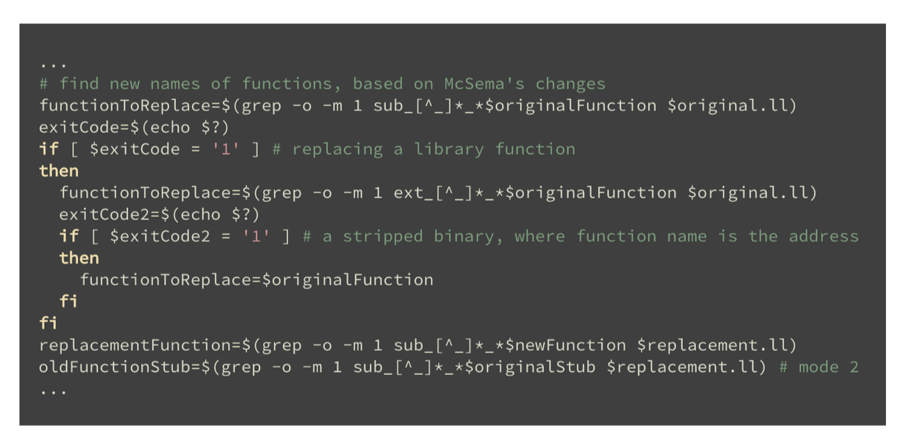 Next, we analyze and tweak the bitcode to find the names of the functions as McSema represents them. This section of code includes support for both dynamically-loaded functions and stripped binaries, which affect the names of functions. We need to know these names so that we can pass them as arguments to the LLVM pass when we actually do the replacement. If we were to look for the names from the original binary, the LLVM pass wouldn’t be able to find any matching functions, since we’re using lifted bitcode.