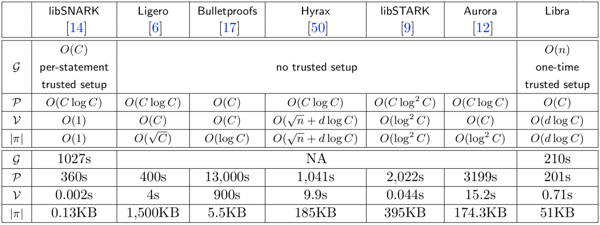 Only Bulletproofs achieve the same asymptotic efficiency, although they run much slower in practice because they require the prover to perform many expensive cryptographic operations. On the other hand, Bulletproofs have no trusted setup phase and make somewhat more standard cryptographic assumptions. The table above, taken from the Libra paper, shows a comprehensive overview of the most performant zero-knowledge proofs.
