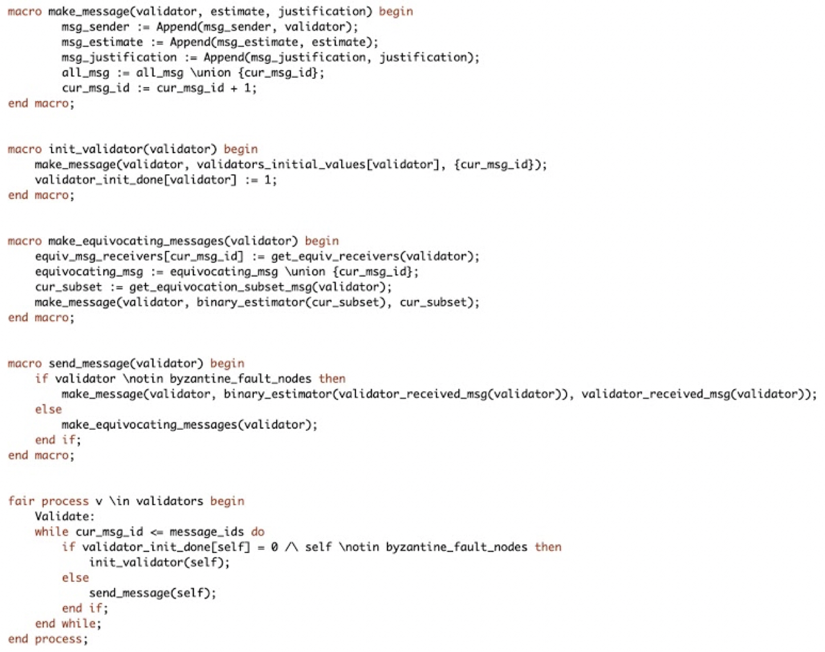 The assumption is that all the messages are sent and received successfully without time delay. The specification does not include message authentication, because it is assumed that the validators can verify the authenticity and source of messages. In this implementation, equivocating validators behave such that they take different subsets of all received messages, use these subsets to obtain the estimates, and send different messages to different validators.