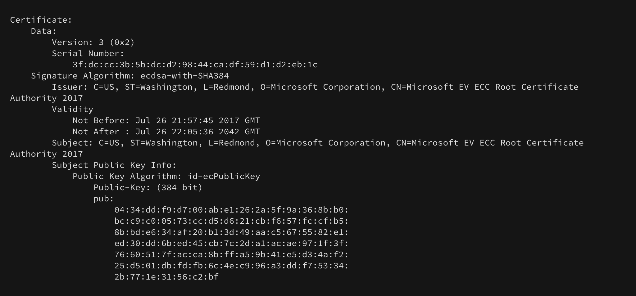 First we need to pick a trusted root certificate. Microsoft maintains a list here. For our purposes, we picked the Microsoft EV ECC Root Certificate Authority 2017. This is a secp384r1 cert, so the public key is a point on the curve defined by the parameters given by the secp384r1 curve.