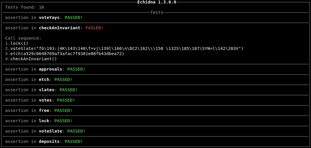 In two years, Echidna has evolved from an experimental tool into an essential resource for fuzzing smart contracts and identifying correctness/security issues. We continue to push the limits of what is possible by fuzzing smart contracts, and keep our open-source tools updated for community use. Learn more about testing your smart contracts with Echidna in our Building Secure Contracts training.