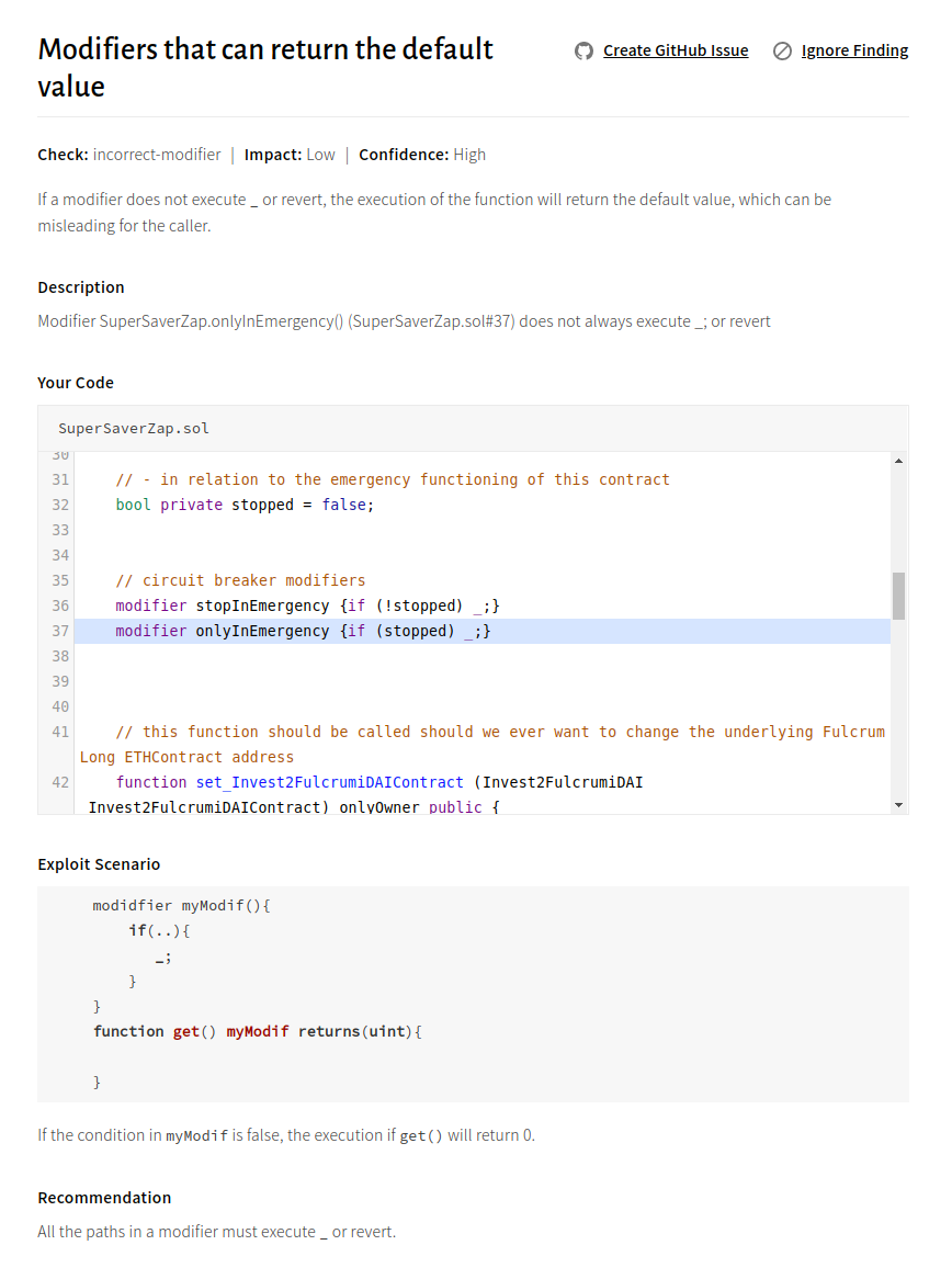 Crytic found one unusual issue in DeFiStrategies: The lack of placeholder execution in a modifier leads the caller function to return the default value. Additionally, Crytic found an issue related to strict equality on the return of a balanceOf call.