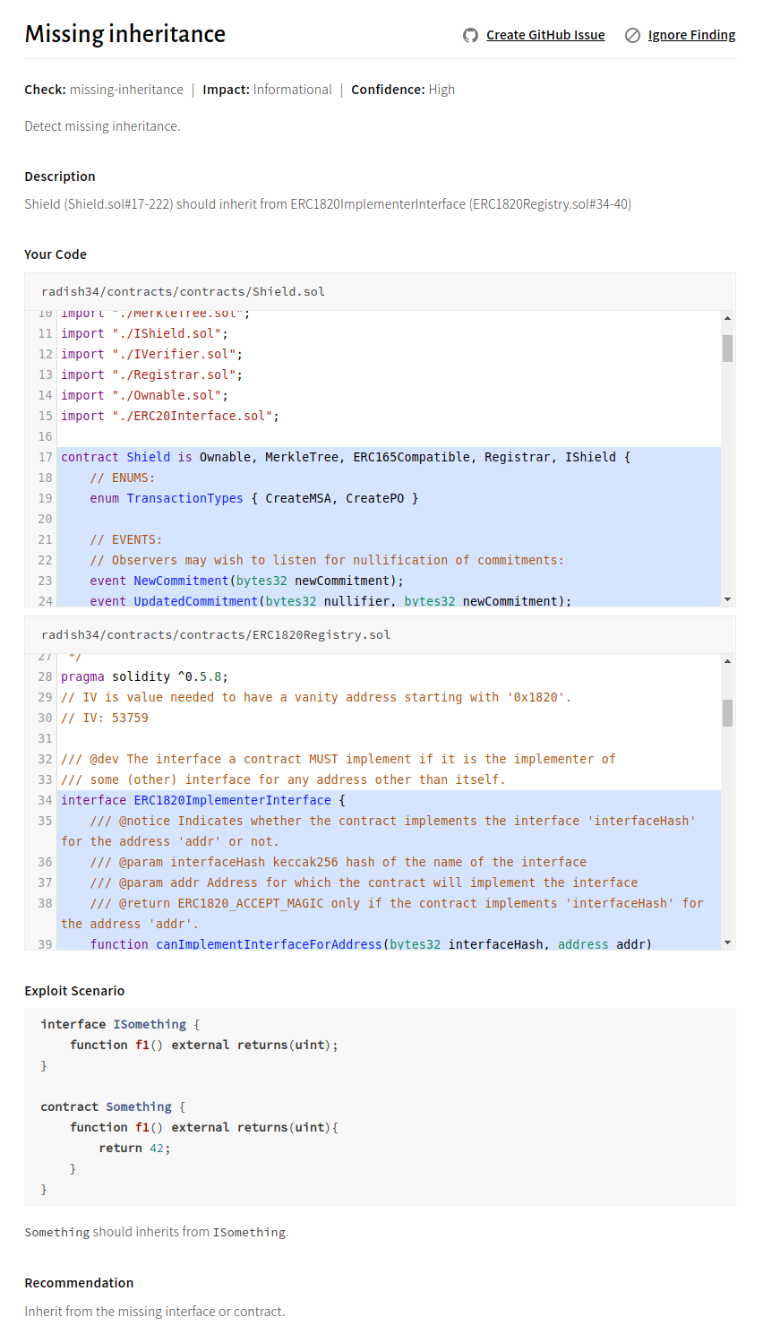 Shield is an implementation of ERC1820ImplementerInterface, but it does not inherit from the interface. This behavior is error-prone and might prevent the implementation or the interface from updating correctly.
