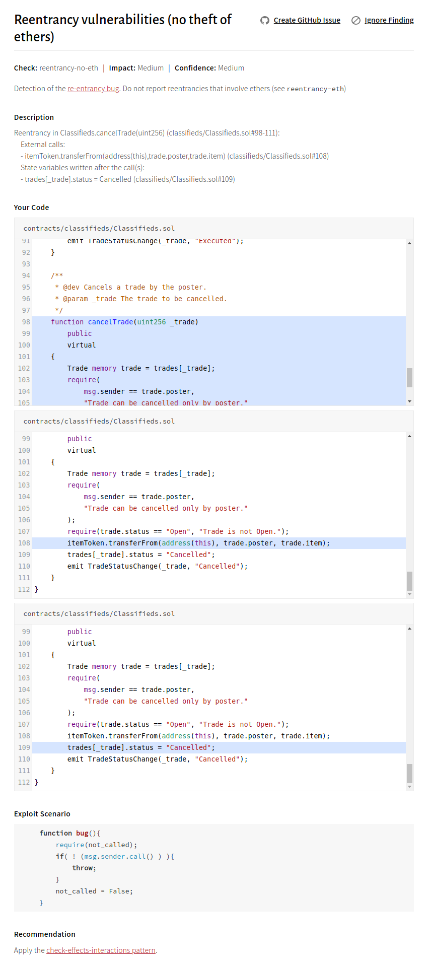 Classifieds calls transferFrom on external tokens without following the check-effects-interaction pattern. This leads to reentrancy that can be exploited by an attacker if the destination token has a callback mechanism (e.g., an ERC777 token).