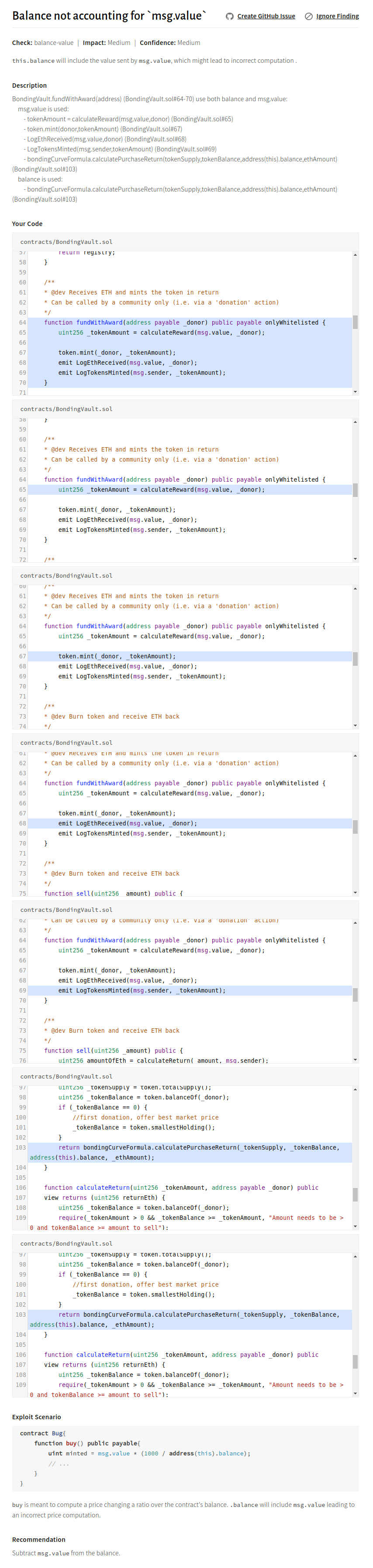 msg.value is already present in this.balance. For example, if this.balance is 10 ether before the transaction, and msg.value is 1 eth, this.balance will be 11 ether during the transaction). As a result, msg.value is used two times, and calculatePurchaseReturn is incorrectly computed.