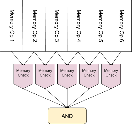 Unfortunately, this approach will produce unreasonably large circuits, since each step of program execution will require a circuit that models both the core processor logic and the entirety of RAM. Even if we restrict ourselves to machines with 50 MB of RAM, producing a ZK statement about an exploit whose trace uses 100 instructions will cause the circuit to be at least 5 GB. This approach is simply too inefficient to work for meaningful programs. The key problem is that circuit size scales linearly with both trace length and RAM size. To get around this, we follow the approach of SNARKs for C, which divides the program execution proof into two pieces, one for core logic and the other for memory correctness.