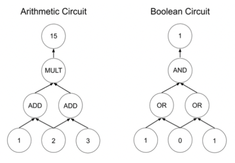 And now for the hard part, and the main barrier that has prevented ZK proofs from being used in practice. Many classical ZK protocols require that the underlying statement be first represented as a Boolean or arithmetic circuit with no loops (i.e., a combinatorial circuit). For Boolean circuits, we can use AND, NOT, and XOR gates, whereas arithmetic circuits use ADD and MULT gates. As you might imagine, it can be challenging to translate a statement you wish to prove into such a circuit, and it’s particularly challenging if that problem doesn’t have a clean mathematical formulation. For example, any program with looping behavior must be unrolled prior to circuit generation, which is often impossible when the program contains data-dependent loops.
