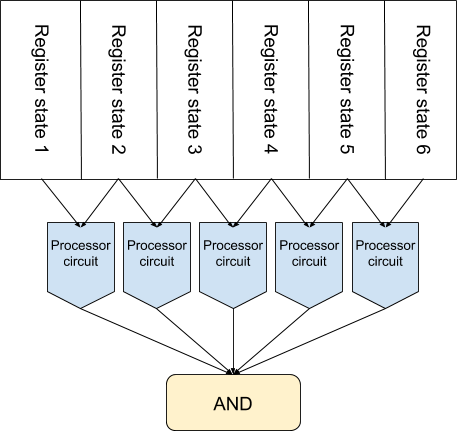 To prove logic validity, the processor circuit must be applied to every sequential pair of instructions in the program trace. The circuit can verify whether one register state can legitimately follow the other. If every pair of states is valid, then the circuit accepts. Note, however, that memory operations are assumed to be correct. If the transition function circuit were to include a memory checker, it would incur an overhead proportional to the size of the RAM being used.