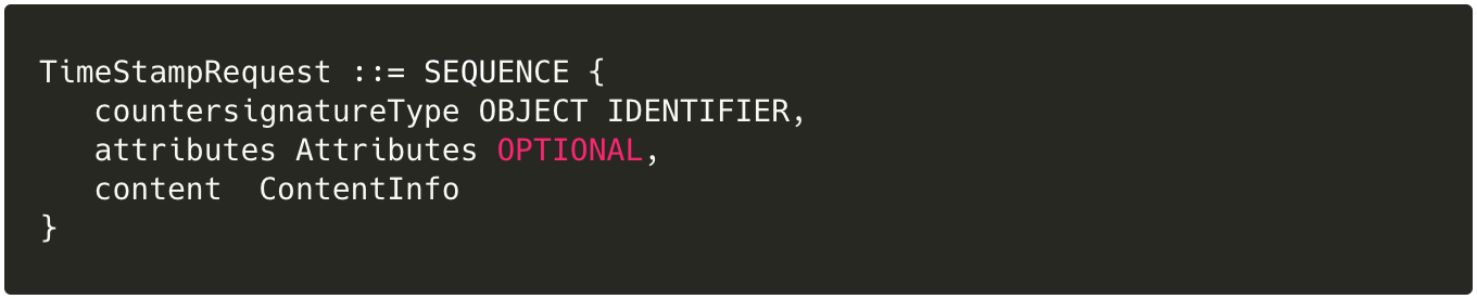 …where countersignatureTypeis the custom Microsoft OID1.3.6.1.4.1.311.3.2.1(i.e.,SPC_TIME_STAMP_REQUEST_OBJID) andcontentis the original Authenticode PKCS#7ContentInfo. - The TSA response is a PKCS#7