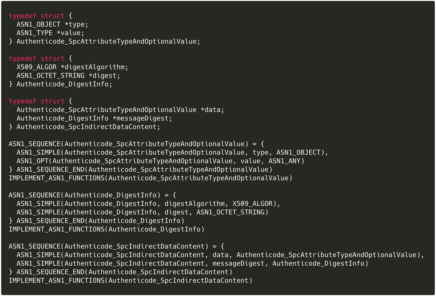 (Observe that the custom AlgorithmIdentifieris actually just X.509’sAlgorithmIdentifier—see RFC 3279 and its updates).⚠ The code below does no error handling or memory management; read the μthenticode source for the full version. ⚠