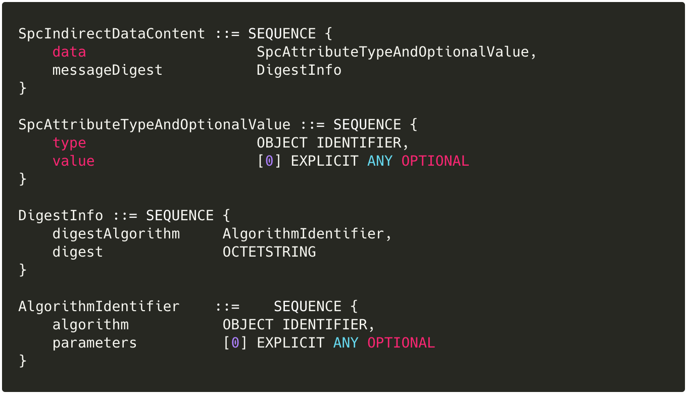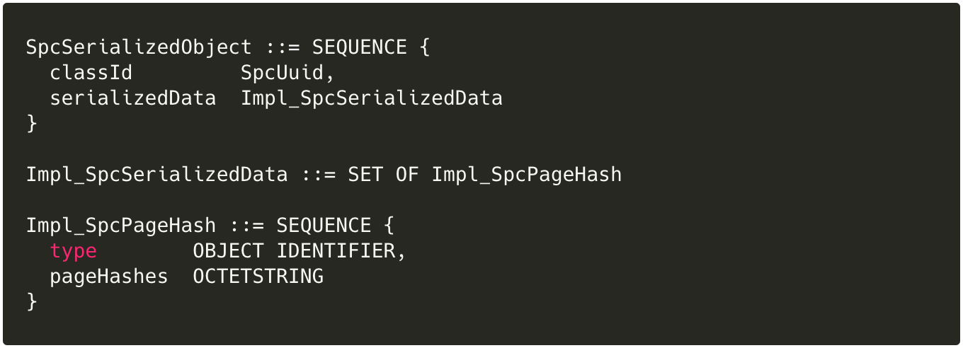 serializedDataof eachSpcSerializedObjectis an ASN.1SET, each member of which is an ASN.1SEQUENCE, to the effect of: