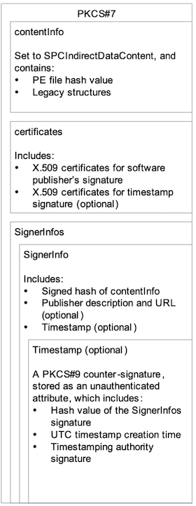 Unlike page hashes, Authenticode’s timestamp countersignature format is relatively well documented, both in official and third-party sources.