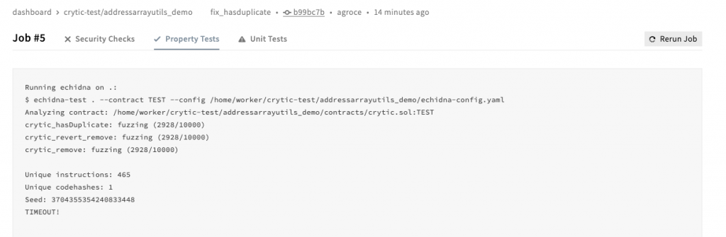 You can run Echidna tests on your own by downloading and installing the tool or using our docker build—but using the Crytic platform integrates Echidna property-based testing, Slither static analysis (including new analyzers not available in the public version of Slither), upgradability checks, and your own unit tests in a seamless environment tied to your version control. Plus the addressarrayutils_demo repository shows all you need for property-based testing: It can be as simple as creating a minimal Truffle setup, adding a crytic.sol file with the Echidna properties, and turning on property-based tests in your repository configuration in Crytic.