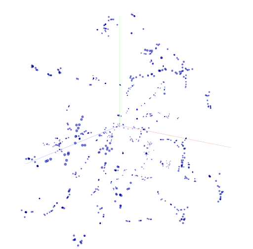The diagram below shows the SlithIR tokens from a set of training Solidity data spherized in a three-dimensional Euclidean space, with similar tokens closer to each other in vector distance. Each purple dot shows one token.