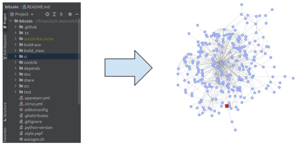 We are proud to announce the release of it-depends, an open-source tool for automatic enumeration of dependencies. You simply point it to a source code repository, and it will build a graph with the required dependencies. it-depends currently supports cargo, npm, pip, go, CMake, and autotools codebases, packages in their associated package managers, and Ubuntu apt.