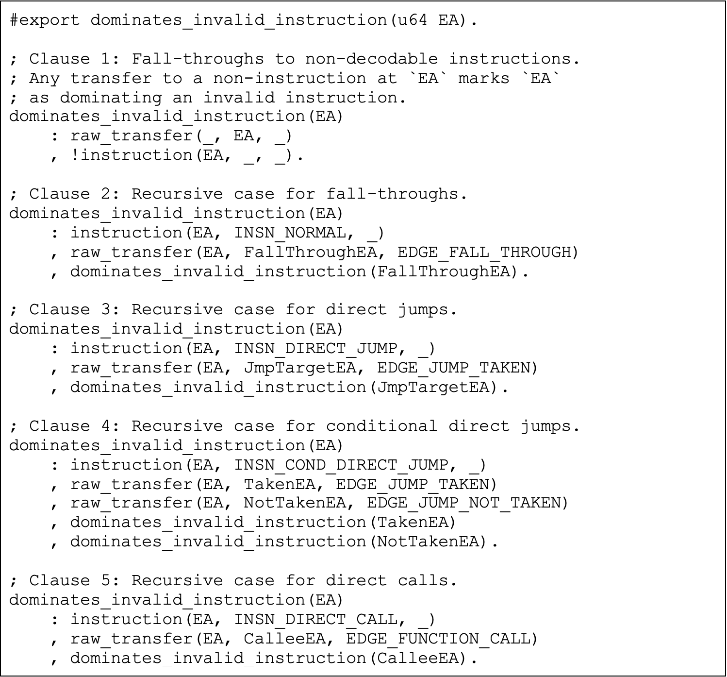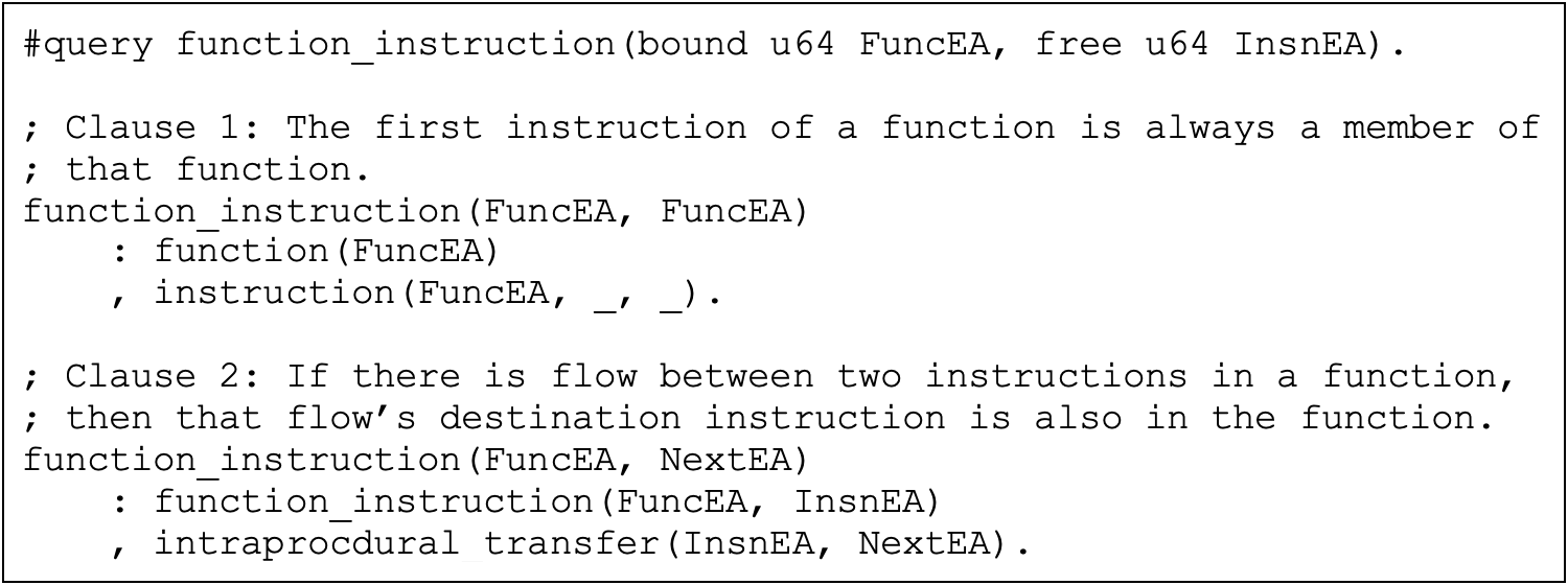 An advantage of using Datalog is the ability to express complex program semantics as a series of simple, recursive relationships. Yet, when handling control flow, a purely recursive approach often breaks certain analyses like function boundary detection: recursive analysis will follow the control flow to each instruction’s targets and resume the analysis from there. But, unlike calls, jumps are not “returning” instructions; so for inter-procedural jumps, the function will not be re-entered, thus causing the disassembler to miss the remaining instructions in the function containing the jump instruction.