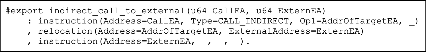 If you’re familiar with IDA Pro or Binary Ninja, you’ll recognize that both tools adjust the relocated calls to point to the external symbols themselves. In the context of binary analysis, this is useful because it “fixes up” the otherwise opaque calls whose targets are revealed only through dynamic linking. In Datalog, we can simply accommodate this with a few lines: