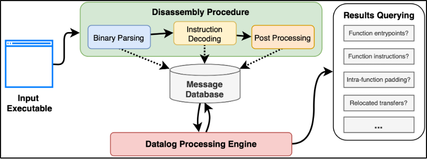 Conventional “run-and-done” disassemblers perform their analyses on the fly, confining them to whatever results—even erroneous ones—are obtained from the outset. Instead, Datalog enables us to move all analysis to post-disassembly, thus streamlining the integration of plug-and-play refinements and retroactive updates. And with its painless syntax, Datalog easily represents one of the most powerful and expressive platforms for user-written disassembly plugins and extensions. We implement our vision of transparent and mutable disassembly as a prototype tool, Dr. Disassembler. While Dr. Disassembler can theoretically use any Datalog engine (e.g., DDLog), we currently use Trail of Bits’ own Dr. Lojekyll. The implementation of Dr. Disassembler discussed in this blog post uses Dr. Lojekyll’s Python API. However, at the time of writing, we have since begun developing a C++-based implementation due to Python’s many performance limitations. Here, I introduce the high-level design behind our initial (and forthcoming) implementations of Dr. Disassembler.