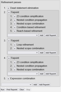 The default chain consists of passes that are executed only once and passes that are computed iteratively to search for a fixed point. However, rellic-xref gives users the ability to change the order and the way in which the refinement passes are run: passes can be removed (using the “x” buttons in the figure above) and inserted at will.