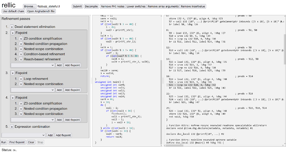 To solve this problem, I developed rellic-xref as a web interface so that Rellic can be used in an interactive and graphical way. rellic-xref spins up a local web server and serves as an interface to the underlying decompiler. When a user uploads an LLVM module, a textual representation of the module is presented in the right-hand pane. The user can then run a variety of preprocessing steps on the LLVM bitcode or proceed to the decompilation step. Preprocessing is sometimes required when the module contains instructions that are not yet supported by the decompilation engine.