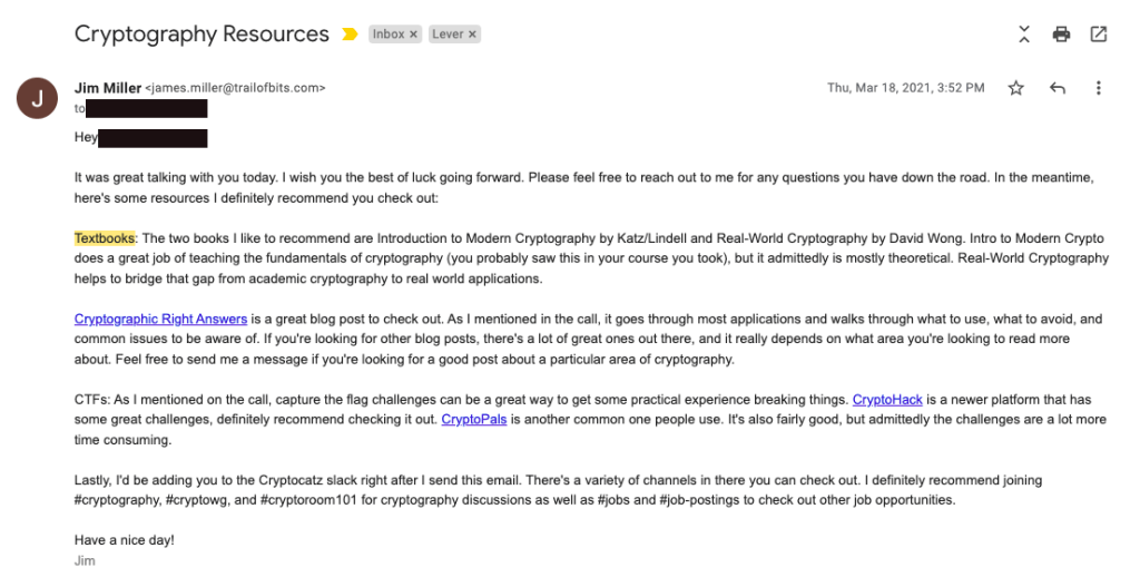 Our Learning & Development Resources document, for example, contains a detailed and actionable list of resources that each Trail of Bits engineer and non-engineer can use to further their career and personal development goals. From books we think you should read to presentations—ours and those of others—you should watch, to references on specific courses we think are great for all of us. Managers will find guides to better leadership, all employees will find access to online classes and courses, and interns can benefit from tips and tricks lists. And engineers will love that we regularly schedule software development and skills-based training for the team and send individuals to targeted training for areas we intend to grow and specialize in.